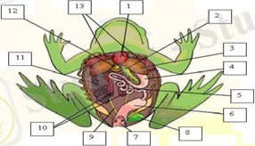 1-жүрек; 2-ұйқы безі; 3-бауыр; 4-қарын; 5-аш ішек; 6-тоқ ішек; 7-клоака; 8-қуық; 9-несеп ағар; 10-бүйрек; 11-аналық без; 12-өт; 13-өкпе.