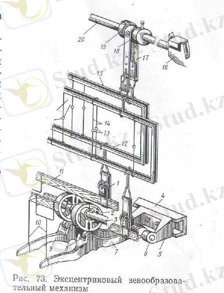 Ортаңғы вал айналғанда экцентриктерде (2) айналады. Экцентриктердің бірі (радиусы үлкені) төмен қарай ашу ричагын жылжытады. Қозғалмалы ремизкамен берілетін майысқақ түйіндеме арқылы (1) ричагпен бірге ілмекте төмен қарай жылжиды.