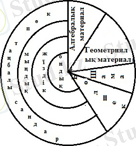 Екінші ерекшелігі . Бастауыш курс материалы шоғырланған түрде беріледі. Ең алдымен ондық бөлшектеуге келмейтін алғашкы он санның нумерациясы оқылады, осы сандарды жазу үшін цифрлар енгізіледі, қосу және азайту амалдары үйреніледі. Сонан сон екінші ондық және 100 көлеміндегі сандардың нумерациясы қарастырылады, разряд ұғымы, ондық бөлшектеуге келетін сандарды жазудың позициялық принципі айқындалады, екі таңбалы сандарды қосу және азайту оқылады, жаңадан арифметикалық екі амал; бөлу және көбейту енгізіледі. Бұдан кейін 1000 көлеміндегі сандар нумерациясы үйреніледі. Мұнда көп таңбалы сандар нумерациясының негізін құрайтын үш разряд (бірліктер, ондықтар, жүздіктер) қарастырылады, арифметикалық амалдар жөніндегі білім жинақталып қорытылады, жазбаша қосу мен азайту әдістері енгізіледі. Ақырында, көп таңбалы сандар нумерациясы үйреніледі, класс ұғымы қарастырылады, цифрлардың 1-сурет орындық мәнінін принципі жөніндегі білетіндері жинақталып қорытылады, жазбаша есептеулер алгоритмі енгізіледі. Сонымен, курста бес концентр бөлініп алынған: ондық, екінші ондық жүздік, мың, көп таңбалы сандар. Нумерацияны және арифметикалық амалдарды қарастырумен бір мезгілде және тығыз байланыста басқа да мынадай мәселелер қарастырылады: шамалар, бөлшектер, алгебралық және геометриялық материал. Материалдың концентрлі орналасуы 1-суретте сызба түрінде берілген.