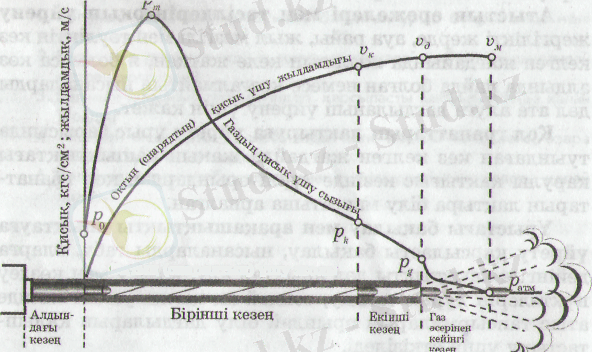 толық енуіне дейін созылады. Осы кезевде ұңғы арнасында окты орнынан қозғайтындай және ату кезеңдері: р д - соғыста өтудің кысымы; р м - газдың ең жоғарғы (максимал) қысымы; р һ және У К - дәрінің толык жануы кезіндегі газ қысымы мен оқтың қозғалыс жылдамдығы; р және v - октың ұңғы арнасынан шыққан кезіндегі газ қысымы мен октың козғалыс жылдамдығы; І м - ок қозғалысының ең жоғарры (максималды) жылдамдьны; р ат - атмосфералык қысымға тең қысым