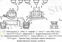 ФХ005, ФХ006 маркалы коміртексіз феррохромды (0, 05-0, 06% С) силикотермиялық тэсілмен қорытады. Процесс барысында доғалы пештерде корытпаларды хром рудасы мен темір оксидтерін, флюс ізбестің қатысуымен силикохроммен тотықсыздандыру арқылы алу қарастырылган. Томен көміртекті феррохромды (<0, 04% С) пештен тыс шөміште руда-ізбесті қорытпаны сұйық силикохроммен бір кезеңдік немесе екі кезендік тәсілмен араластыру арқылы силикотермиялық әдіспен жүргізеді. Сг2Оэ -30, MgO 7-8, А120 3 7-8, ҒеО 10-12, Si02 1-3 жэне СаО 40- 45 % мөлшері болатын руда-ізбесті қорытпаны негізгі шегені бар колбеу тұрған доғалы пеште фосфордың томен мөлшері (кесектердің ірілігі <25 мм) бар хром рудасын жэне <90% СаО жэне >0, 006% Р мөлшері бар ізбесті қорыту арқылы немесе - 900 °С температурамен руда-ізбесті қоспадан (хром рудасы мен әктасты бірге күйдіру кезінде алынған) алады. Бір кезеңді тэсілде қорытылган қожды магнезитті қаланған шомішке қүяды да, өлшейді, сосын оган сұйық силикохромды құйыгі тастайды (1-сурет) . Қорытпаларды бір ыдыста араластыру кезінде, хром мен темірді руда-ізбесті қорытпадан кремниймен тотықсыздан- дыру кезінде температура 2400 °С жетеді, яғни қатты шихта қосымшасын балқыту мүмкіндігі қамтамасыз етіледі (силикохром жэне феррохром ондірісінің қалдықтары түрінде) .