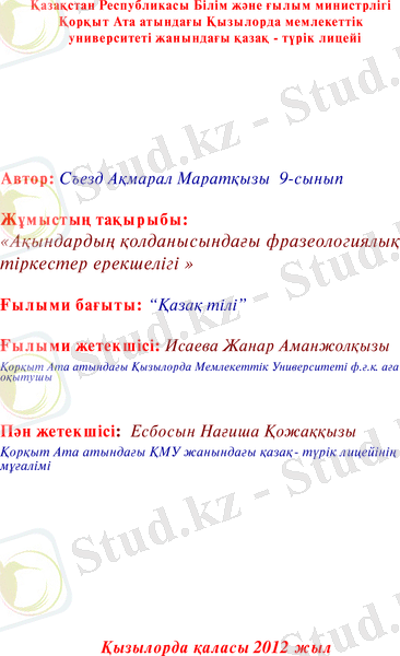 Фразеологияны зерттеген барлық еңбектерді дерлік зерттеп қарап шыққаны, теориясына пайдалана білгендігі жұмыс соңындағы пайдаланған әдебиеттер тізімінен байқалады. Жұмыс өзінің лайықты бағасын алады деп сенемін.