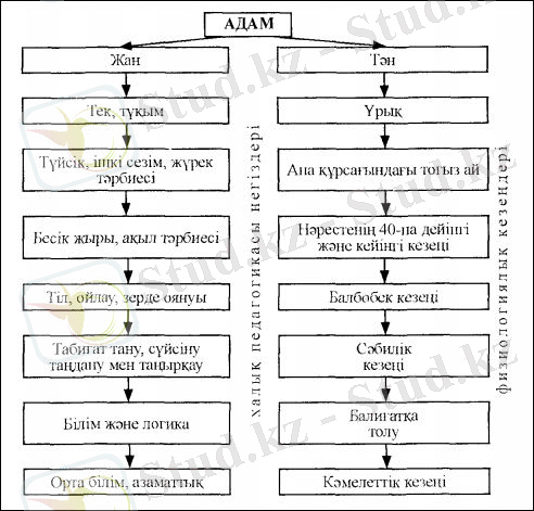 Тіпті, өсу кезеңдерінің уақыт мерзімдері жеке-жеке даралана тұра, үзіліссіз тәрбие тәсілдерінің әсерімен өзінің біртұтас үндестіктерін жалғастыра береді. Енді адамның өсіп жетілуін қамтамасыз ететін оның жеті түрлі физиологиялық кезеңдері - ұрық тазалығы -- ана құрсағындағы тоғыз ай - нәресте - балбөбек - сәбилік - балиғат - кәмелеттік - деп аталынатын жеті кезеңіне тоқталып көрелік.