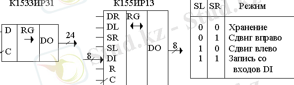 Қозғау регистрінің микросұлбасының ішінде(сур. 9. 3), мысалға К155ИР13 әмбебап регистр болып табылады. Жады регистрі көбінесе D-триггерінде, олардың тактілерін біріктіре отырып құрады. Мысалға, сегізразрядты жады регистрінің микросұлбасы тұрақты деңгеймен (К580ИР82) тактіленеді және тактілі импульстің (К555ИР27) фронтмен (сур. 9. 1) . Бірінші микросұлба шығысынан сақталған мәліметтер ОЕ кірісінің логикалық нөлде оқылады.