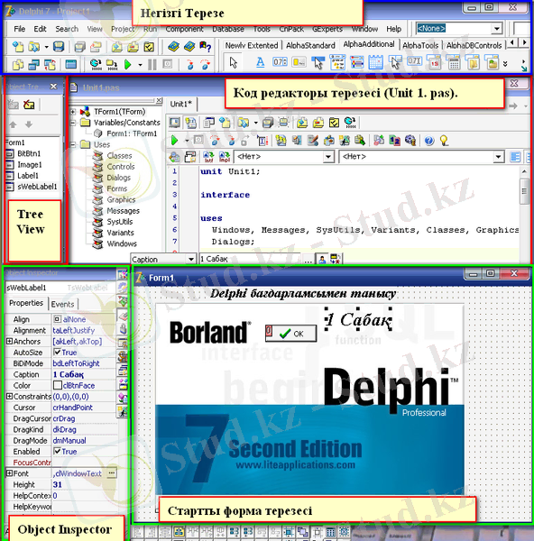 Delphi -дің интегралданған ортасын құру бағдарламалауға деген қызығушылық күн сайын өсуде. Бұл Қазіргі кезде дербес компьютерлерді пайдаланушылар арасында Windows операциялық Delphi - бұл Windows операция жүйесіндегі жұмыстарға Интегралданған ортаны жасау (Integrated Development Environment-IDE, құрал панелі, кескін редакторы, Windows іске қосу. Бағдарлама мәзірінің көмегімен Delphi 1-сурет. Delphi 7 жасаудың интегралданған ортасы. Негізгі терезесінің жоғарғы бөлігінен, сіздер бас мәзір жолағын көріп Интерфейстің құрамына төрт терезе кіреді:
