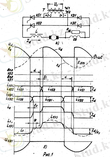 Диодтардың коммутациясы кезінде және оның аяқталғанынан кейін u d түзетілген кернеуі ашық VD1 және VD2 диодтарындағы кернеудің азаю суммасына тең болады, яғни жасалған болжамдарға сәйкес нөлге тең. Коммутация аяқталғаннан кейін, ω 2 орамасы жүктеме тізбегінен жабық VD2 диоды арқылы ажыратылып қалады. Ток, қозғалтқыштың орамаларында және жатықтауыш дроссельде пайда болатын өзіндік индукцияның ЭҚК-інің ықпалымен өтеді. Трансформатордан жүктемеге энергияны жеткізу VS2 тиристорын ашқан кезде жаңартылып отырады. Тиристорға бағытталған басқарушы сигналдың берілу сәті жарты периодтың басынан бастап саналатын α басқару бұрышының көмегімен анықталады. Тиристор VS2 ашылғанда, екінші реттік ораманың ЭҚК-і (оның полярлығы сур. 1, а жақшада көрсетілген) VS1 тиристорына кері бағытта қосылады. Нәтижесінде, тиристорлардың коммутациясы процесі жүре бастайды - i VS1 тогы біртіндеп нөлге дейін азаяды, ал i VS2 нөлден I d -ге дейін өседі.