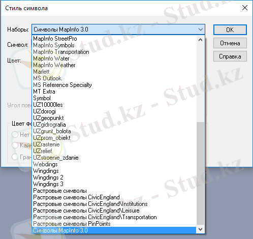 - батырмасы «Нышан» диалогын ашады, нүктелік объектілерінің рәсімінің түрін өзгерту үшін қолданылады. Осы объектінің көмегімен нышанның түрін, оның көлемін және түсін өзгерте аламыз.