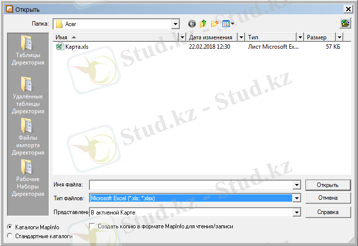 «Открыть» көмегімен файл түрін - Файл атын көрсетіп алынады. Содан кейін экранда тағы бір диалог терезесі пайда болады, ол файлмен жұмыс істеу режимін таңдап алуға көмектеседі: «Excel бағдарламасынан алынған ақпарат». (Қосымша Б)