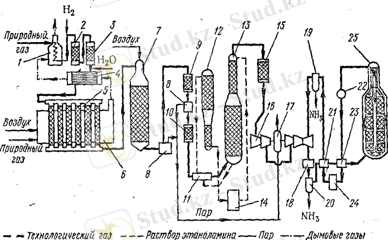 3. Төменгі қысымдағы(80-100атм) болып бөлінеді, температура 450-500 0 C арасында болады. 1тонна аммиак алу ушін 3000м 3 азот- сутек қоспасы, 90м 3 су және 1750kкал -сағат электр энергиясы керек. Екі түрлі аммиак алынады: А түрі тоңазтқыштар үшін, Б түрі әртүрлі өндірісте қолдануға, азот қышқылын алу үшін. А түрінде 99, 8% аммиак керек, Б түріне 99% аммиактан төмен болмауы керек. Сары түске боялған аммиак деген жазуы бар болат баллондарда 30атм. қысымды аммиакты тасиды. Бір кг аммиак сұйық 1, 76 л көлемде алады. Аммаиакты көп мөлшерде тасу ушін арнайы цистерналар қолданылады. 2, 5 атм қысым немесе 12, 8 атм қысыммен 50м 3 дейін сыйымдылықта.