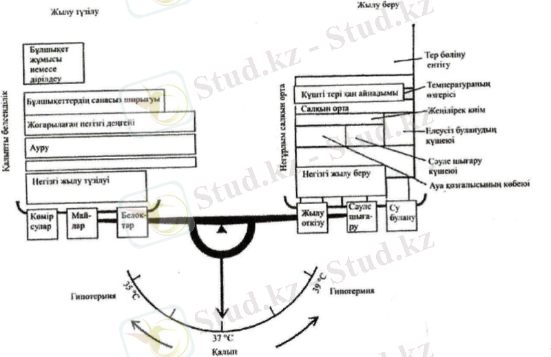 Жылу балансы. Дене температурасы тұрақты болу үшін жылу шыгару сыртқы ортадан немесе метаболизмдік жылу өндіру нәтижесінде келетін мөлшерге тең болу қажет. Егер жылудың берілуіне қарағанда келуі көп болса, жылу жинақталып температурандщ жоғарылауын, яғни гипертермияны тудырады [6] .