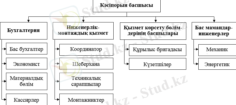 Кәсіпорынның функциональдық қызметкерлері - жұмыскерлер, мастерлер, диспетчерлер, монжаж жүргізуші, механик және т. б. Кәсіпорынның ұйымдастыру құрылымының түрі төмендегі сурет 1-де көрсетілген.