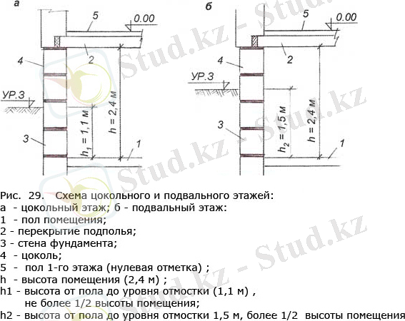 а-цоколь қабаты; б-жертөле қабаты; 1-еден; 2-аражабын; 3-іргетас қабырғасы; 4-цоколь; 5-1-нші қабат едені (нөлдік деңгей) ; h- үй-жай биіктігі(2, 4 м) ; h1-еден деңгейіне дейін биіктік (1, 1 м) ; h2- еден деңгейіне дейін биіктік (1, 5 м) ;