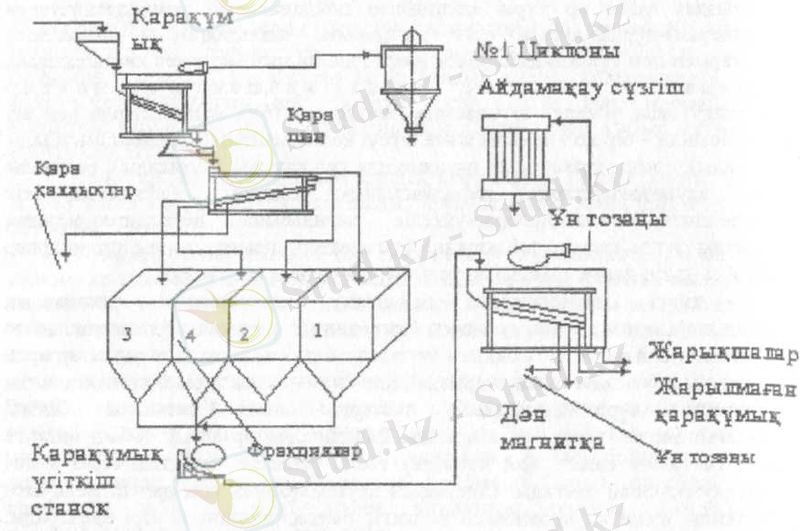 Қара құмық астығы 11 қоспадан тазартылуы үшін, диаметрі 8 . . . 10 мм (жоғарғы тор көздері 5 мм, төменгісінікі - 1, 8x20 мм) қабылдағыш елеуіші бар сепараторға түседі. Көтерілген шан циклонға 2 түседі. Магнитті аппараттан өткен астық ірілігіне қарай сұрыпталынуы үшін қатөқабаты елеуішке түседі: біріншісінің тор кезінің диаметрі 4, 1 мм; екіншісінікі - 3, 5; үшіншісінікі-3, 1; төртіншісінікі 2, 7 . . . 2, 5 мм. Нәтижесінде астықтың терт фракциясын алады. Сонғы елеуіштен еткен астықты қалдыққа 1 жібереді. Сұрыпталған астықтар жекелеген жанақтарға түсіп, олардан білік қақпақты станоктарға жіберіледі,