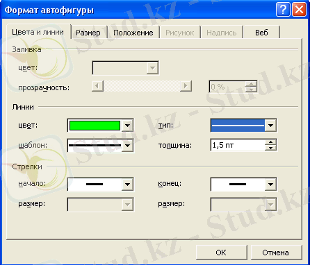 Сызықты даярлап алған соң, оның төңірегінде тышқанды екі рет шертсеңіз, экранға «Салынған объект» («Рисованный объект») деген сұқбат терезесі шығады. Енді сызық параметрлерін, яғни оның сызылу стилін (тұтас немесе пунктирлі), түсін, қалындығын және т. б. (19. 1-сурет) таңдап алуға болады.