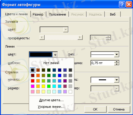 - тұйық сызықпен қоршалған фигураның ішкі аумағын бояу үшінТолтыру түсі (Цвет заполнения) батырмасын пайдалануға болады. Осы батырманы тышқанмен шерту түстерді таңдауға мүмкіндік беретін сұқбат терезесін ашып береді (2. 2-сурет) ;