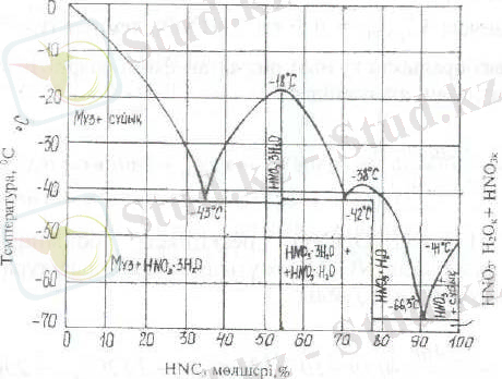 Мұнда кристалдану температурасы -18 0 C HNO 3 *3H 2 O (53, 8% HNO 3 ) және -38 0 C HNO 3 *H 2 O (77, 8% HNO 3 ) қосылыстарының бары байқалады.