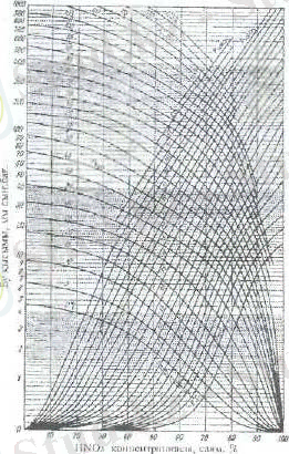 HNO 3 -H 2 O-N 2 O 4 cистемасындағы қату сызықтары (2 суретте), ал азот қышқылының қайнау температурасы (3 суретте ) көрсетілген. Құрамында 68, 4% HNO 3 бар қоспа азеотроптық қоспа.