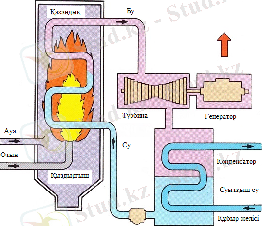 Дәстүрлі жылу электр станцияларында отын бумен пеште (бу бұрын да бу генераторлары деп аталады) қыздырылып, қыздыруға және арнайы түтікшелерде (су құбыры қазандығында) қазандықтың ішіне сорылған суды ағызуға мүмкіндік береді. Алынған жоғары температурада (400-650 градус цельсийге дейін) және қысымды (бірліктен он мпаға дейін) жоғары қызып кететін бу бу бүйірінен турбогенераторға - аралас бу турбинасына және электр генераторына жіберіледі. Көп сатылы бу турбинасында будың жылу энергиясы электр генераторы орнатылған біліктің айналу механикалық энергиясына ішінара айналдырылады. ЖЭС зауытында бу жылу энергиясының бөлігі желілік жылытқыштарда да қолданылады. (Сурет 1)