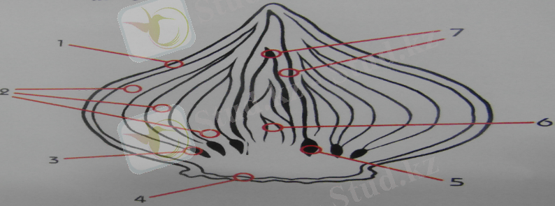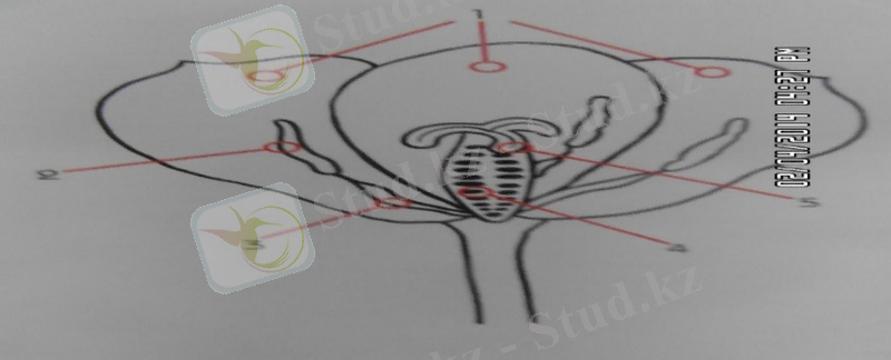 1 - гүл серігі жапырақшалары 2 - тозаңдықтары 3 - аталық жіпшелері 4 - аналық түйіндегі ұрық бүршіктері 5 - аналық ауызы