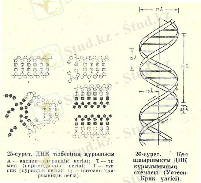 1953 ж. Дж. Уотсон және Ф. Крик ұсынған ДНҚ құрылымының үлгісі (моделі) генетикалық хабардын (шартты қысқарту), мутациялық өзгергіштіктің және гендердің көшірмесінің (ДНҚ молекуласының бөліктері) алынуын түсінуге мүмкіншілік берді. 1957 ж. М. Мезельсон мен Ф. Сталь, Дж. Уотсон және Ф. Криктің бактериялық клеткадағы ДНҚ-ның жартылай консервативті түрде екі еселенуі (репликация) жөніндегі көзқарасын көзқарсын дәлелдеді (27-сурет) . Ал Г. Стент ДНҚ екі еселенуінің үш түрін ұсынды: 1) консервативтік (лат. «консервативус»-сақтаушы, негізгі қалпын сақтау) еселенудеұрпақтық ДНҚ-ларда аналық ДНҚ-ның материалы болмайды; 2) жартылай консервативтік түрінде ДНҚ-ның жаңа молекуласының бір тізбегі аналық ДНҚ-дан болса, екіншісі-жаңадан құрылған тізбек; 3) дисперсиялық лат. «дисперсис»-шашырау, бытыраңқы) түрінде аналық ДНҚ-ның материал кездейсоқ шашырап жаңа ДНҚ молекуласында орын алады.