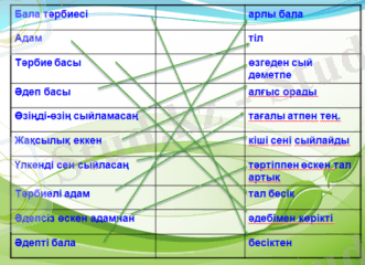 Сіздерге екі бағанда сөз тіркестері мен сөздер берілген. Осы сөздерді пайдалана отырып, халық даналығындағы мақал немесе нақыл сөздерді құрастырыңыз.