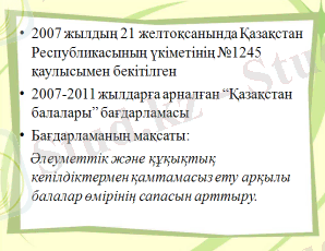 - 2007-2011 жылдарға арналған “Қазақстан балалары” бағдарламасы