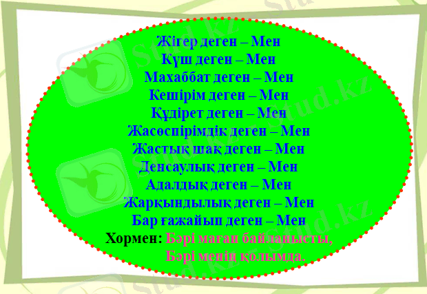 Мақсаты: Өзіндік адамгершілік құндылықтарын оқушы бойына дарыта отырып, оның