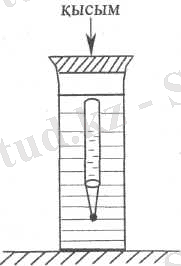 Енді “картезиан с‰њгуірі” деген атпен кењінен белгілі аспапты мысал ретінде негізге ала отырып, ќысым µскенде кµлемі азаятын дененіњ тепе-тењдік к‰йін ќарастырайыќ (5-сурет) . Су толтырылып, серпімді жарѓаќпен жабылѓан биік шыны ыдыс ішінде ж‰к бекітілген ашып аузы тµмен аударылѓан шыны т‰тік ќалтќы орналасќан.
