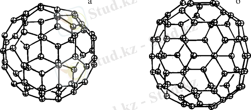 Сур. 1. С 60 және С 7 о фуллерен молекулаларының құрылымы [24] . Симметрияға байланысты C 60 молекуласында барлық атомдар біркелкі жағдайда, ал С70 молекуласында атомдардың бес түрлі позициялары бар.