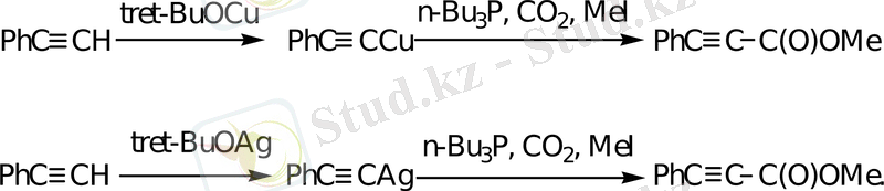 н-Вu 3 P жәнеи трет-BuOAg қатысында СО 2 мен фенилацетиленнен фенилацетилкарбон қышқылының шығымы 70% құрайды.