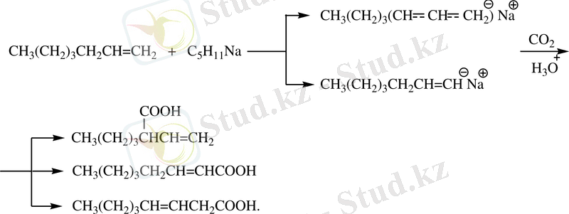 Бөлме температурасында алкиллитий және амилнатрий α-олефин металлдану кезінде аллилді және винилді жағдайда көміртек қатысында металлорганикалық қосындылардың қалыптасуымен сутек атомының орынбасуы жүреді. Соңғы көміртек диоксидімен карбоксилдеу барысында шексіз қышқыл түзіледі [4-5] :