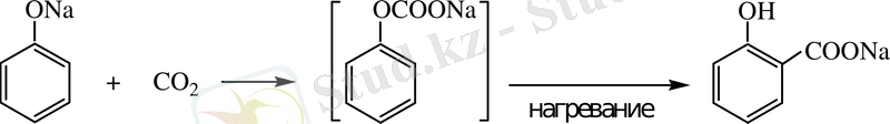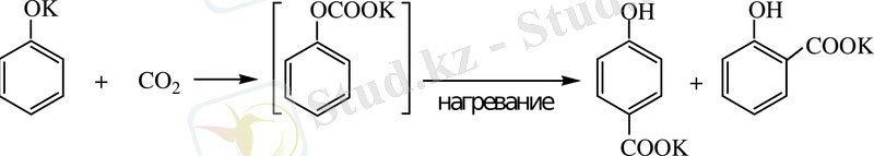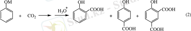 Шамамен 150 жыл бұрын Кольбе-Шмидт реакциясын H. Kolbe және E. Lautemann ашқан [35-37] . Содан кейін сілтілі металл диоксид көміртек фенолят реакциясын R. Schmitt және E. Burkard жетілдірген [38] . Натрий және калий феноляттары диоксид көміртекпен жоғары қысым мен температурада салицил мен n-оксибензой қышқыл түзу арқылы химиялық реакцияға түседі: