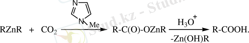 Металды алкилтуындылардың электртерістігі <1, 5 диокси көміртекпен әрекеттеседі, ал электртерістігі >1, 5 болған жағдайда әрекеттестікке түспейді [6-7] . Үшалкилалюминий (алюминидің электртерістігі 1, 05) көміртек диоксидімен әрекеттестікке оңай түседі, ал диалкилцинк (цинктің электртерістігі 1, 6) атмосфералық қысымда бөлме температурасында реакцияға түспейді [8-9] . Тек реакциялық ортаға үштік аминдерді енгізу метилимидазол немесе пиридин типтілер негізгі реагенттің реакциялық икемділігін арттырады [10] :