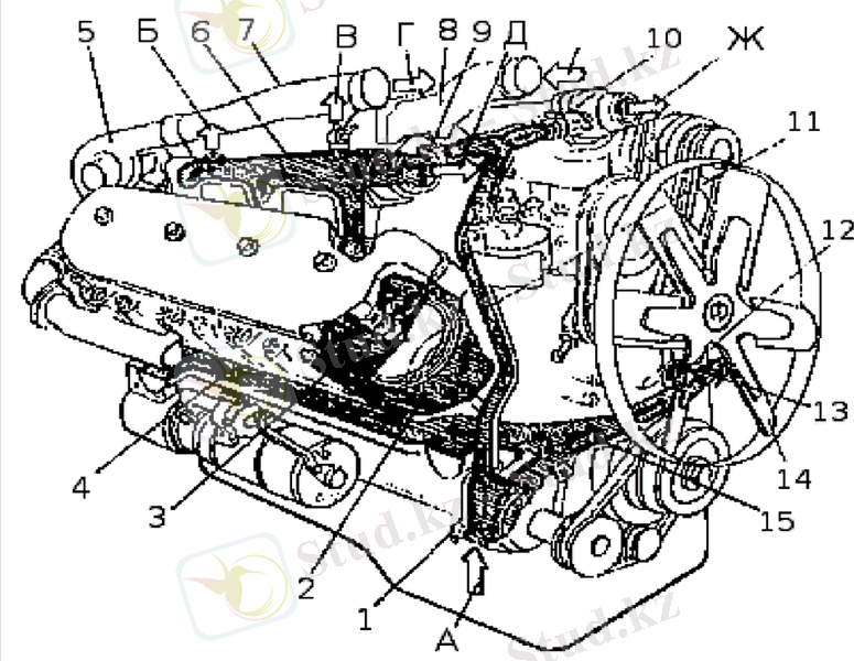 Ж - ауа сығымдағыш суытқышына сұйықтықты беруi; Д - радиаторға; цилин-дрлерден ауаның шығару суытқышы болып қарсатырылады.