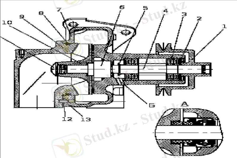 1 - ерiксiз іске қосатын шкив; 2-тоқтатқыш сақина; 3 - ішпектер; 4 - білiкше; 5 - сұйықтық қайтырғыш; 6 - тығыздауыш кесiк; 7 - үрлегiштiң тұрқы; 8 -тығыздағыш сақина; 9 - үрлегiштiң су сорабының түтiгi; 10 - кiшкене қанат; 11 - кiшкене қанаттың бұқтырмасы; 12 - тығыздағыш сақина;