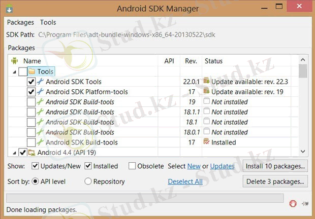 SDK Manager - Android SDK компоненттерін жүктеуге мүмкіндік беретін құрал. Android SDK дестелерін және олардың мәртебелерін көрсетеді: орнатыл- ған (Installed), орнатылмаған (Not Installed), қол жетімді жаңартулар (Update available) . Android SDK Manager 1. 1 суретте көрсетілген.