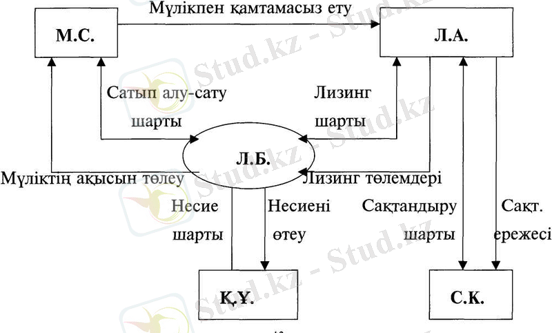 Қымбат жобаны жүзеге асыру кезінде түлғалардың саны көбейе түседі. Бүл лизинг берушінің шартқа басқа қаржы көздерін (банктерді, сақгандыру компанияларын, инвестициялық қорларды және т. б. ) қатыстыруымен байланысты. Енді біз мына суретте (1. 1-сүреті) лизинг шарты мен қаржы ағымдарының жалпы желісін (үлгісін) көрсеткіміз келіп отыр.
