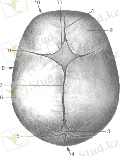 1-sut frontalis 2-tuber frontale 3-fonticuli posterior 4-os occipitale 5-sul lamboidea 6-tuber paritale 7-sut sagittalis 8-os paritale 9-sut coronalis 10-os frontale 11-fonticulus anterior.