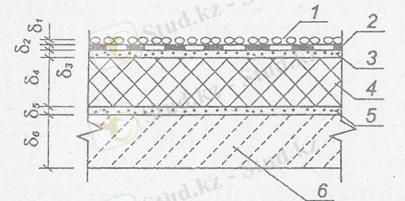 1-битум мастикасына сіңірілген малтатастар; 2- 4 қабатты рубероид; 3-цементті құм ертіндісі; 4-керамзитті бетон; 5-цементті құм ертіндісі; 6-темірбетонды тақта.