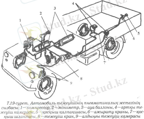 Автомобильдің пневматикалық жетегінің құрамды бөліктерінің орналасуы 7. 19-суретте көрсетілген. Пневматикалық жетек тек қана доңғалақ тежеуіші ғана емес, басқада автомобильдің ауамен істейтін құрылғылардың жұмысын қамтамасыз етеді. Ауа баллондары (3) сығылған ауа запасын сақтау үшін пайдаланылады. Тежеу кезінде ауа баллоннан камераларға (4 жөне 9) өтеді де, дөңгелекті тежейді. Доңғалақты пневматикалық жетек іліністі ажырату механизмінің қосымша жұмысын қамтамасыз етеді, ауаны шинаға жел айдау жөне отын багына май қүю үшін пайдалануға мүмкіндік береді.
