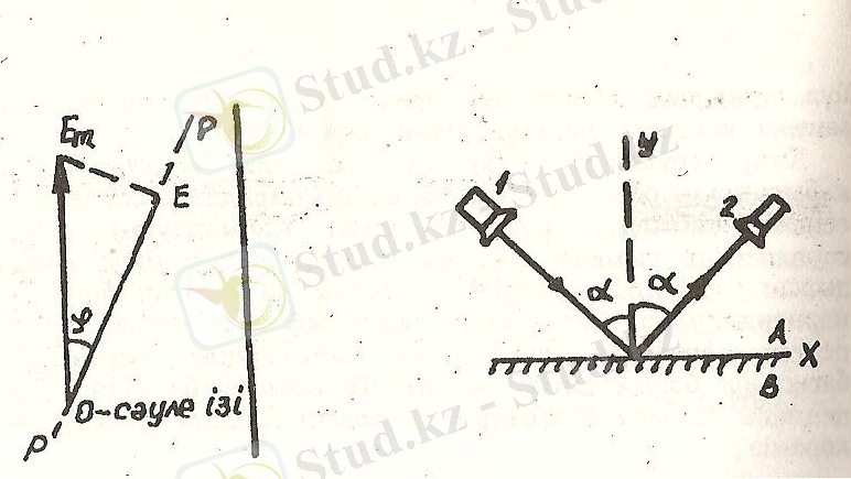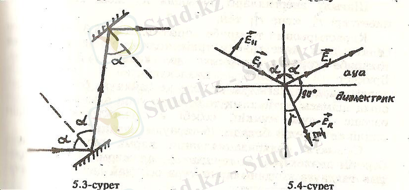 Түсу келе жатқан толқындағы Ē векторының бағыты ретсіз және тез өзгеріп отырады делік (жарық дегеніміз жарқыраушы дене атомдарының ретсіз сәулелену актілерінің жиынтығы болғандықтан, бұл құбылыс мүмкін болады) . Бұл кезде диэлектрик молекулаларының тербелісін анықтайтын сынған сәулеге перпендикуляр болады (5. 4-сурет) . Егер α бұрышы шағылған сәуле бағыты сынған сәулеге тұрғызған нормаль дәл келетіндей етіп алынса, онда түсу жазықтығында жатқан Ē векторы құраушысының кескіні алынбайды. Бірінші пластинкадан