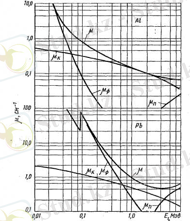 3 - сурет. Қорғасын және алюминиден өткен γ - кванттардың жұтылу коэффеценттері μ ф , μ к және μ ж - тың энергияға тәуелділігі. [2]
