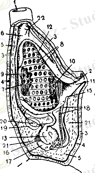 1- ауыз сифоны; 2 - клоака сифоны; 3 - туника; 4 - мантияның эктодермасы; 5 - мантияның қабаты; 6 - жұтқыншақ; 7 - жұтқыншақтық іші; 8- желбезек сақы” лаулары; 9 - эндостиль; 10 -арқа сайы; 11 - желбезек айналасындағы қуыс; 12 - желбезек айналасын-дағы қуыстың ке-регесі; 13 -қарын; 14 - бауыр өсінділері; 15- артқы тесіп; 16 - аталық безі; 17-анапық безі; 18 - жыныс жолдары; 19 - жүрек қабы; 20 - жүрек; 21 - шажырқай; 22 - нерв түйіні.