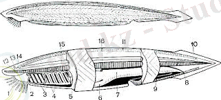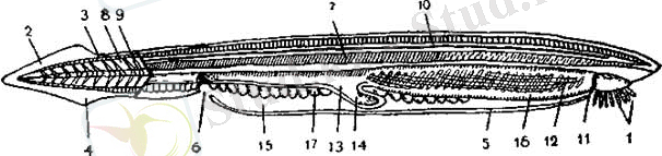 1- қармалағыштармен қоршалған ауыз алды тесігі; 2 - құйрық қанаты; 3-арқа қанаты; 4 -кұйрық асты қанаты; 5-метаплевральды қатпар; 6 - атриальдық тесік; 7-хорда; 8 - миомер (тек қана құйрық бөлімдегілері көрсетілген) 9 - миосепта; 10 - нерв түтіп, 11 - желкен, 12 -желбезек саңылаулары; 13-ішек; 14-ішектің бауыр өсіндісі; 15 - желбезек айналасындағы қуыс; 16 - эндостиль; 17 - жыныс бездері.