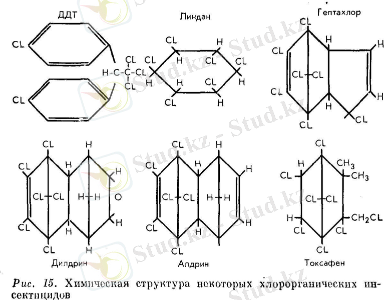 - хлорорганикалық қосылыстар - гексахлоран, ДДТ (дуст) гексахлорциклогексан, полихлорпинен, полихлоркамфен т. б. Олар организмде жинала алады да, ыдырауы бірнеше ондаған жылдарға созылады. Хлорорганикалық қосылыстар диоксиндермен қосылысып, тұрақты органикалық қосылыстар түзеді.