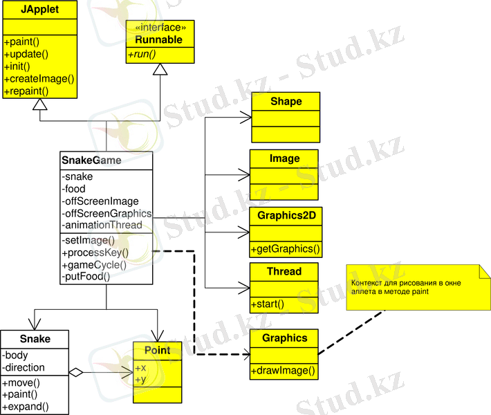 Аплеттің негізгі класы SnakeGame ойынын инкапсулирлейді: