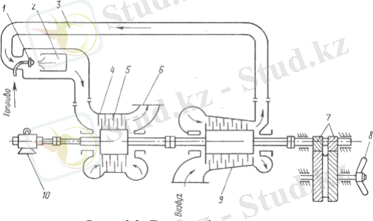 3- Сурет . Дара күштік агрегат. 1- форсунка; 2- жану камерасы; 3- ауа құбыры; 4- қалақша; 5- жұмыс қалақшалары; 6- потрубка; 7- редуктор; 8- тескіш винт; 9- компрессор.