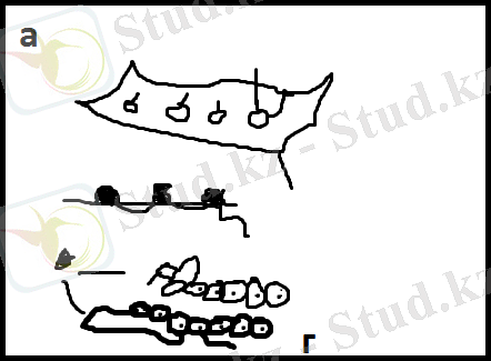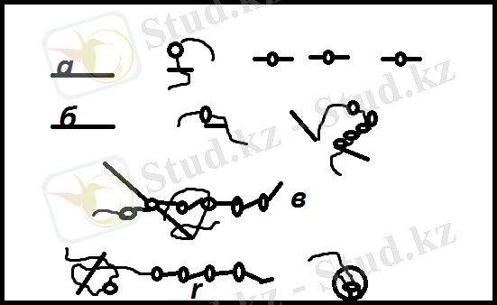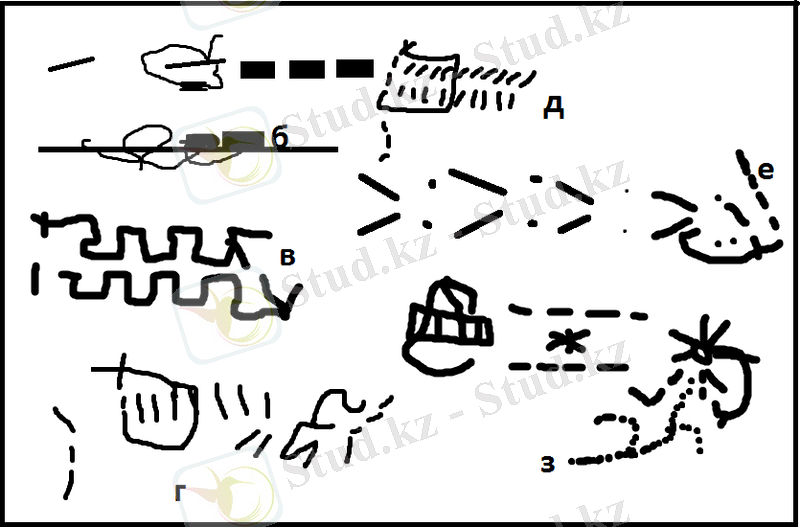 3 сурет. Стекляруспен кестелеу: а-в- «инені алға қарай» және «иненің артынан»; з-штрих түріндегі аралық қолданылады. Стеклярусті матаға «инені алға қарай» және «ине артынан» бір немесе бірнеше қатарларға орналастырады. Гүлдер, ағаш жапырақтарын кестелеу барысында көп жағдайда штрихтік аралық қолданылады.