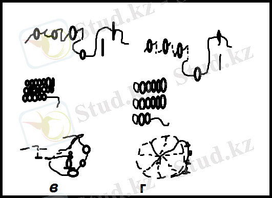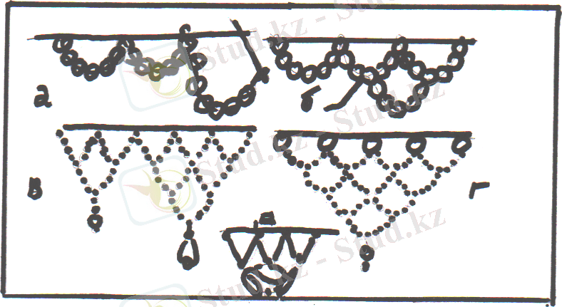 7-сурет. Сумоншақтан дайындалған ажурлы тістемелер бахрамасы: а, б-жұмыс тәртібі; в, г-тістемелер нұсқалары; д-стеклярусты қолдану.