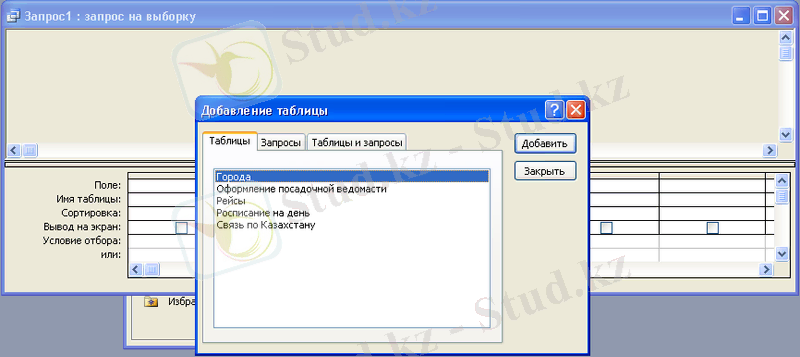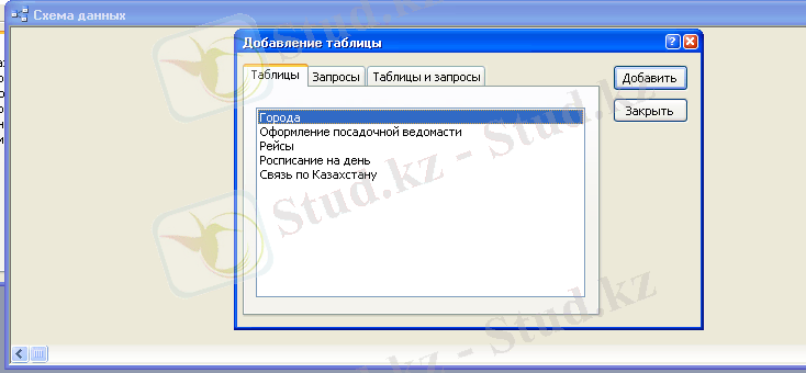 Содан кейін Добавление таблицы деген терезе шығады. Онда біз Рейсы, Связь по Казахстану және Города кестелерін таңдаймыз (22-сурет) .